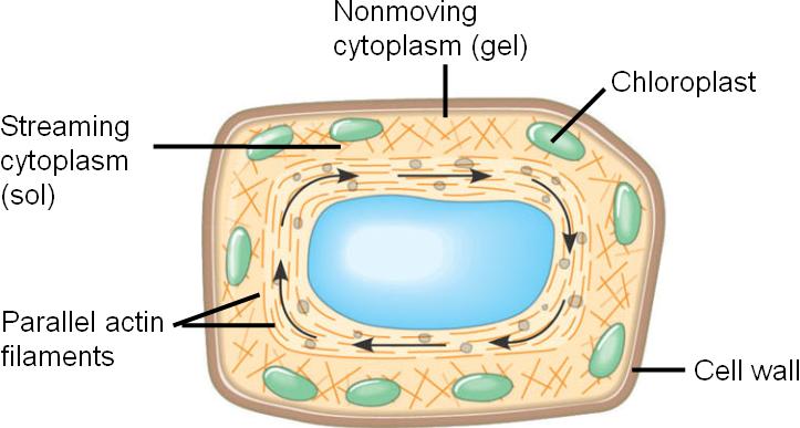 A layer of cytoplasm cycles around a plant cell, moving over a carpet of parallel actin filaments.