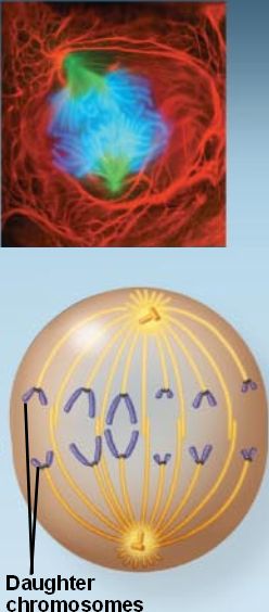 The 2 sister chromatids are transported by spindle microtubules toward opposite ends of the cell,