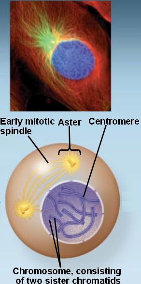 The mitotic spindle begins to be formed from microtubules, which radiate from the centrosomes and appear as star-like asters.