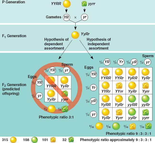 The P plants of this dihybrid cross are true-breeding: one with yellow-round seeds and the other with green-wrinkled seeds.