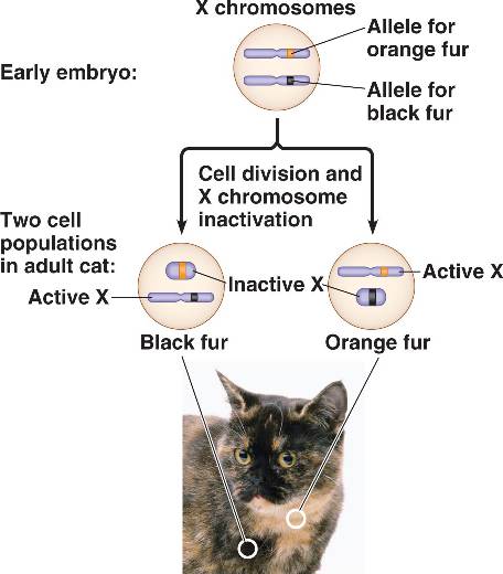 In a heterozygous "mosaic" female, orange patches are formed by cells in which the orange allele is active; black patches have cells in which the black allele is active.