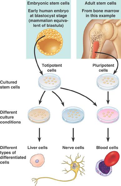 Adult stem cells harvested from tissues such as bone marrow, intestinal wall, and brain, are pluripotent, able to give rise to a few cell types.