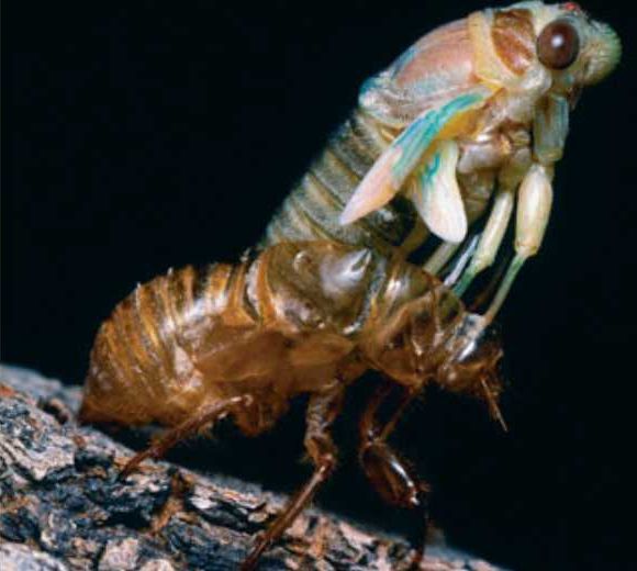 This cicada is in the process of emerging from its old exoskeleton.