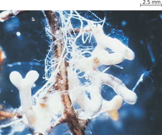 Most plants form symbiotic relationships with fungi to form mycorrhizae, consisting of plant roots united with fungal hyphae, which provide an extensive surface area for the absorption of water and minerals.