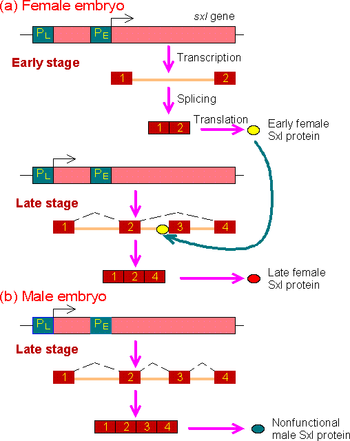 - In the late female embryo, the sxl protein produced in the early stage may mask the splicing signal for the